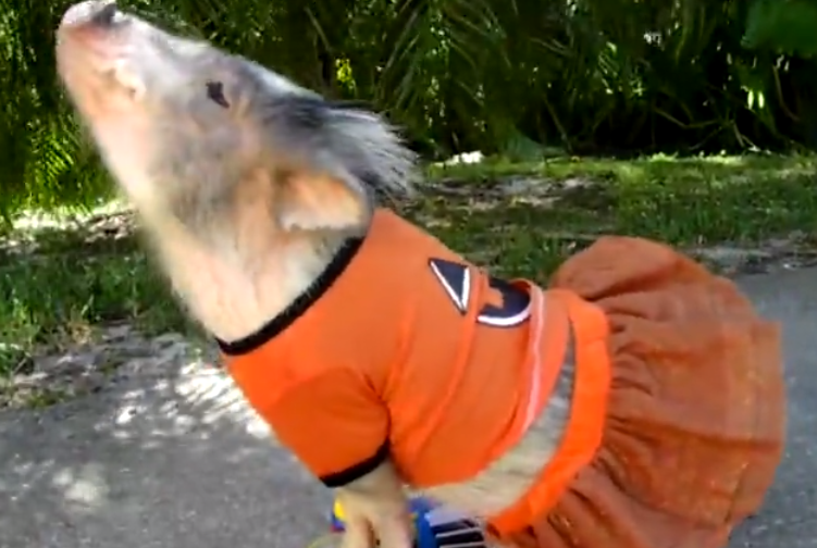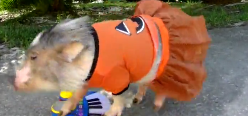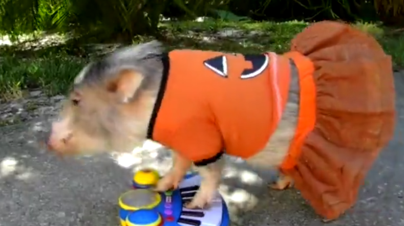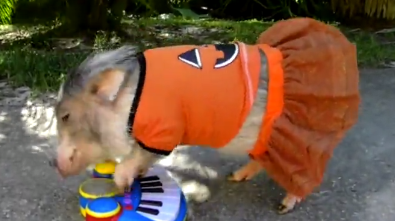 This beautiful little pig dressed up in a little girl’s costume wearing a fluffy red skirt and matching red top while playing the piano.
