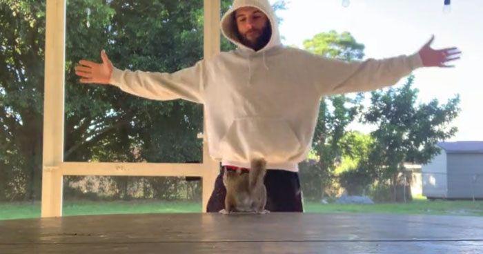 The video shows a man playing with his pet rescue squirrel named Petina on the back porch of his Port Saint Lucie, Florida home while doing exercise.