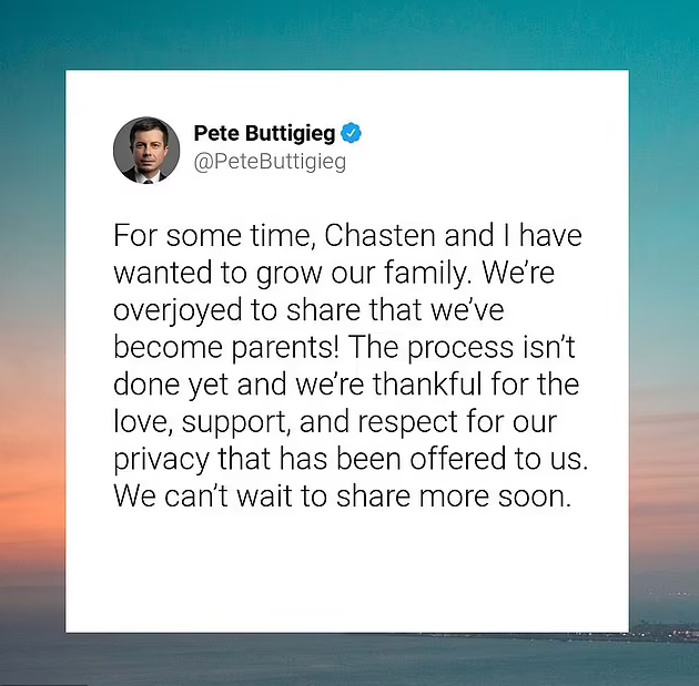 In a tweet Buttigieg posted in August, he wrote: “We’re overjoyed to share that we’ve become parents! The process isn’t done yet and we’re thankful for the love, support, and respect for our privacy that has been offered to us. We can’t wait to share more soon.”