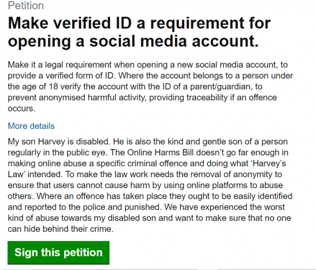 “Make it a legal requirement when opening a new social media account, to provide a verified form of ID,” the petition reads.