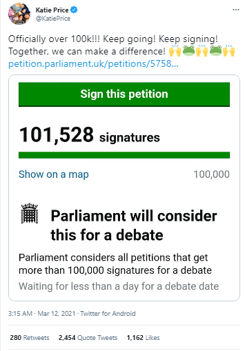 Katie Price explained the petition and wrote: “My son Harvey is disabled. He is also the kind and gentle son of a person regularly in the public eye. The Online Harms Bill doesn’t go far enough in making online abuse a specific criminal offence and doing what ‘Harvey’s Law’ intended.”