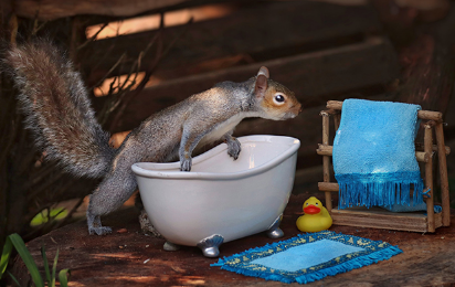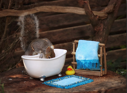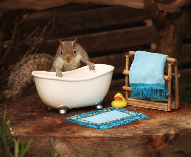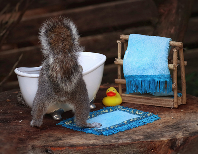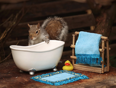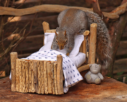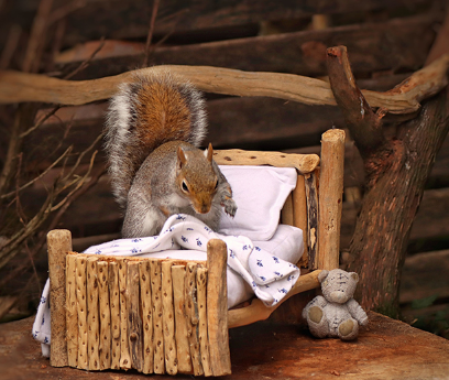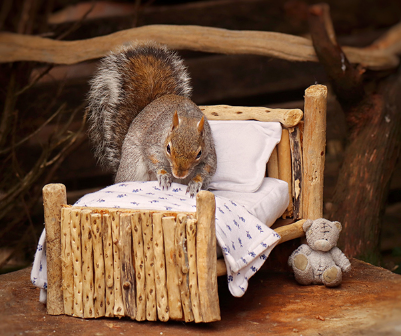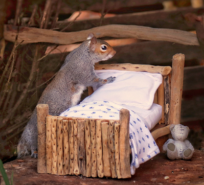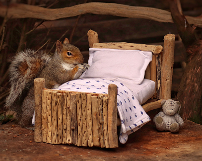She took the pictures of a squirrel around the bed and posted it on her Facebook account. She wrote “Cyril the squirrel was tired from the hectic day at work.