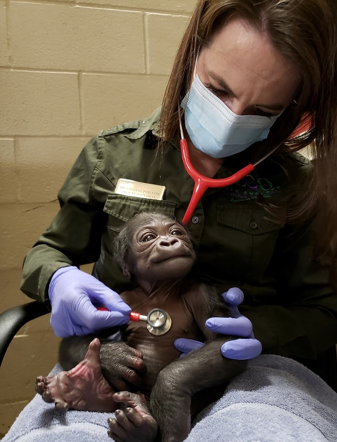 Photos taken at a Boston zoo show an adorable little gorilla that was born to a 39-year-old mother via C-section.