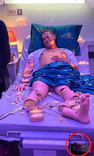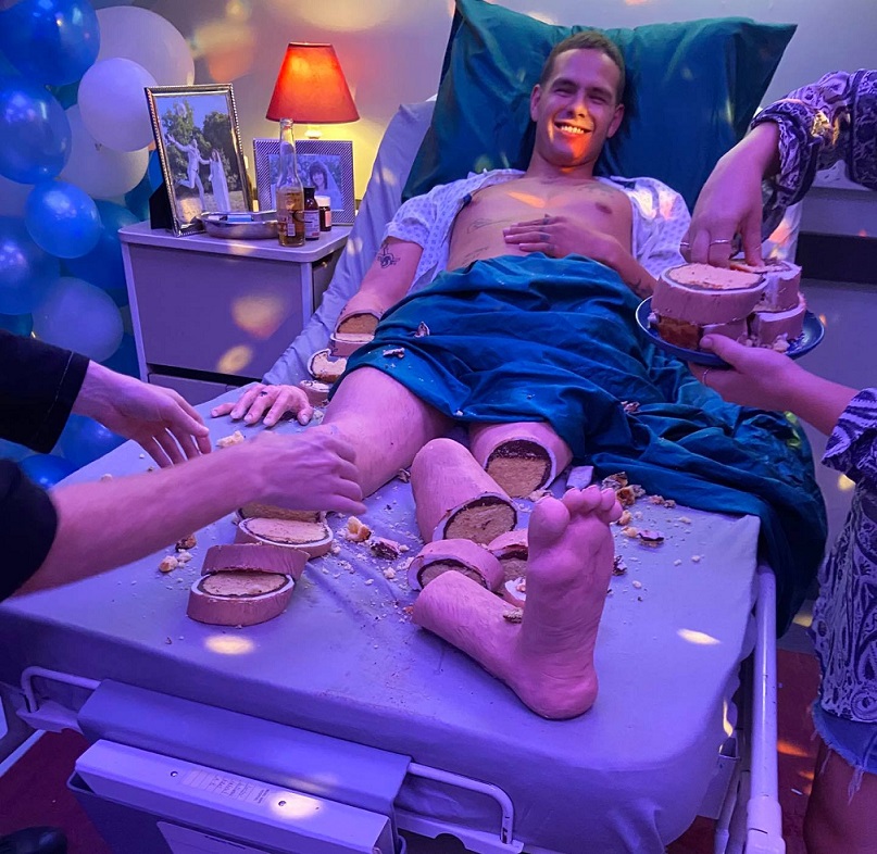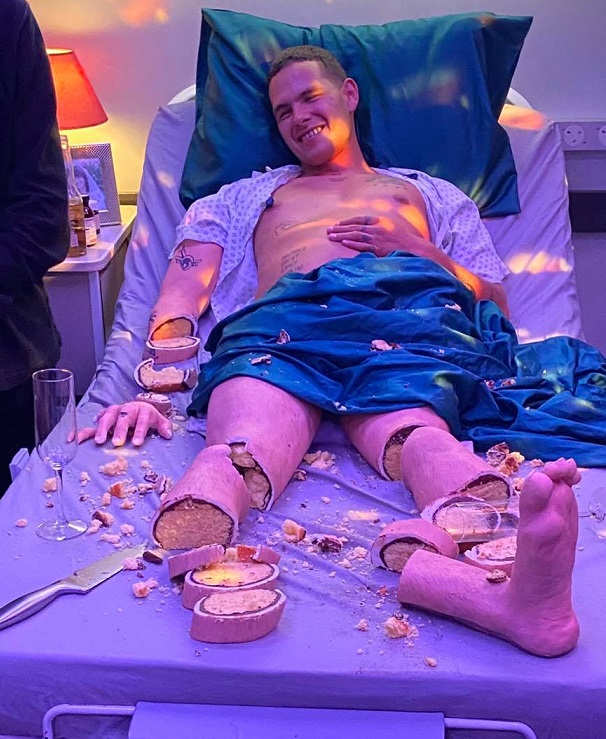 People have been left stunned by photos of a man who is lying on a hospital bed and is partially made of cake.