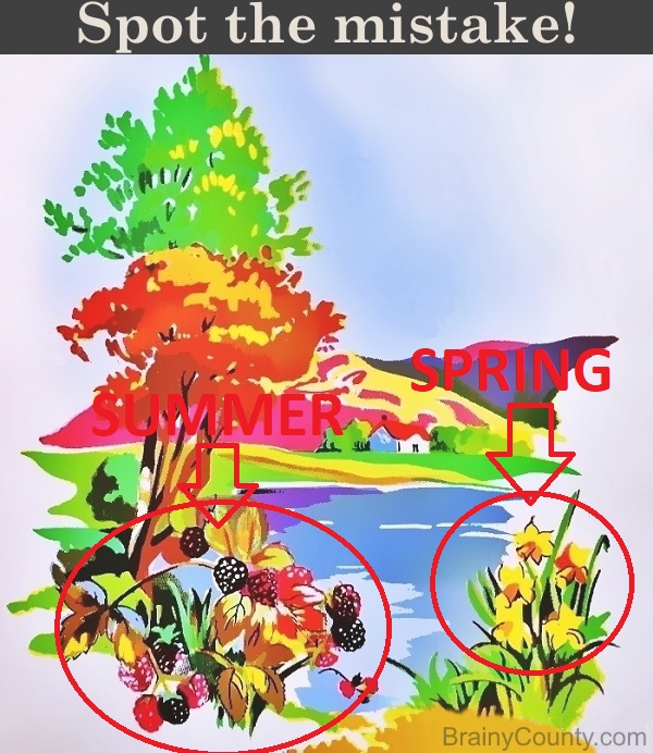 If you took a close look at the picture, you probably saw brambles with blackberries and raspberries on them. Maybe you even noticed the colorful trees and the house in the distance. But where’s the error?