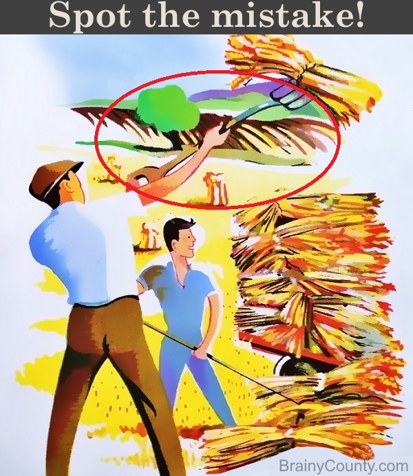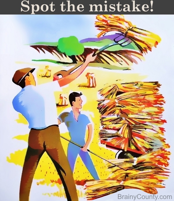 This time, you’re looking at diligent farmers who are stacking hay on their truck. Somewhere in the picture, there is also an error. Find it!