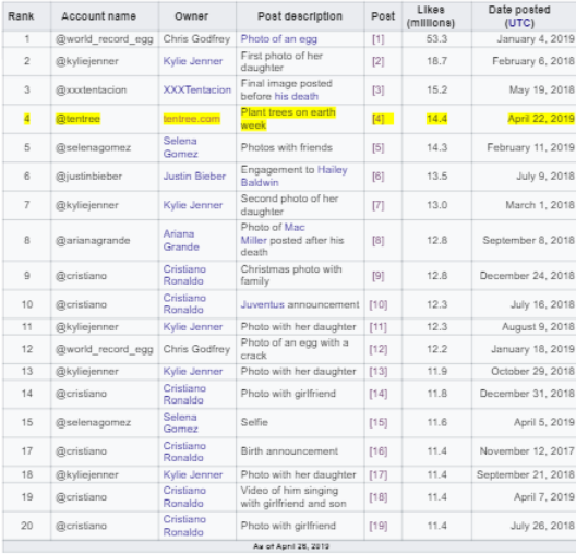 Well, the picture is not stopping and it strands on number 4th on the list of the most liked picture on Instagram. We just hope the 20 million bar happens are there can be 1 million more trees in the world.