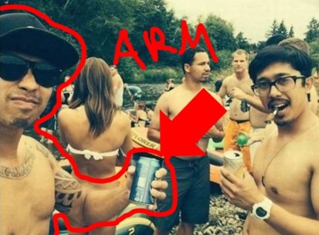 At it happens, the guy to the left is holding a beer can and his arm is cleverly bent to make it look as if the woman behind him wasn’t wearing any bikini.