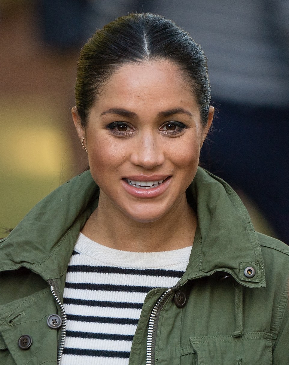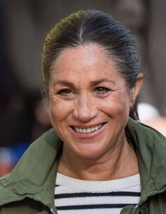 #1 Meghan Markle pictured during a Morocco visit in 2019 vs Meghan as a grandmother with wrinkles around her eyes in an edited photo