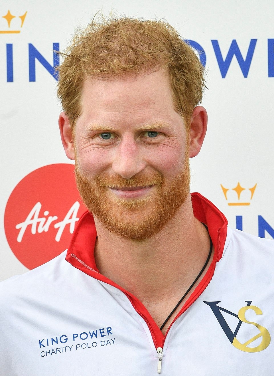 #2 Prince Harry pictured in The King Power Royal Charity Polo Day shirt vs Harry as a grandpa with his signature smirk hiding behind his beard