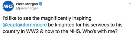 On his Twitter handle, the host said that he would like to see the inspiring Captain Moore receive a knighthood for his service to the country during World War II and now with NHS.