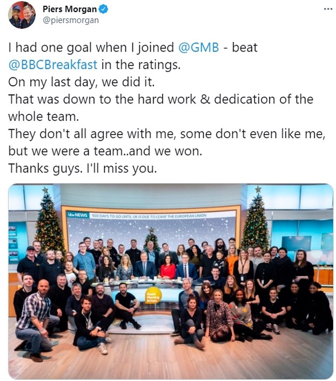 “To all my supporters, I just wanted to drop you a note of thanks,” Morgan wrote in his first major statement after walking out of GMB.