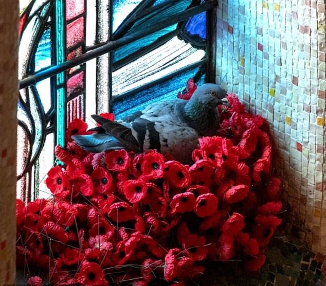 However, a worker noticed the beautifully crafted nest of poppies next to the stained-glass window.