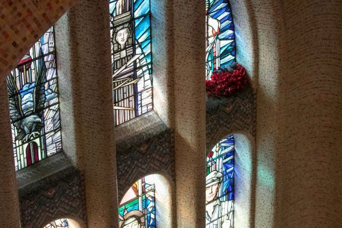 The Australian War Memorial posted a photo of the new temporary resident resting in a beautiful nest made of poppies by the stained glass windows of the memorial.