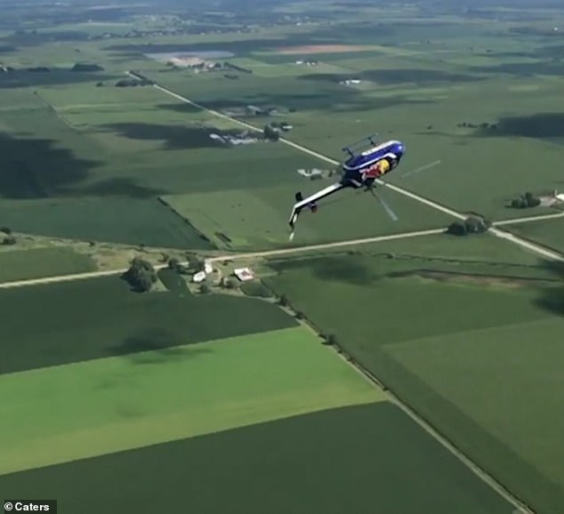 The video shows the pilots turning the helicopter with the Red Bull logo upside down to perform a backflip and letting it fall towards the ground.