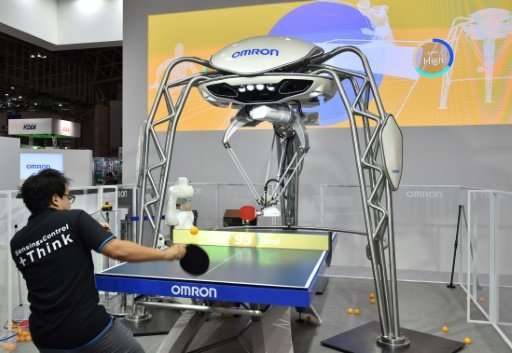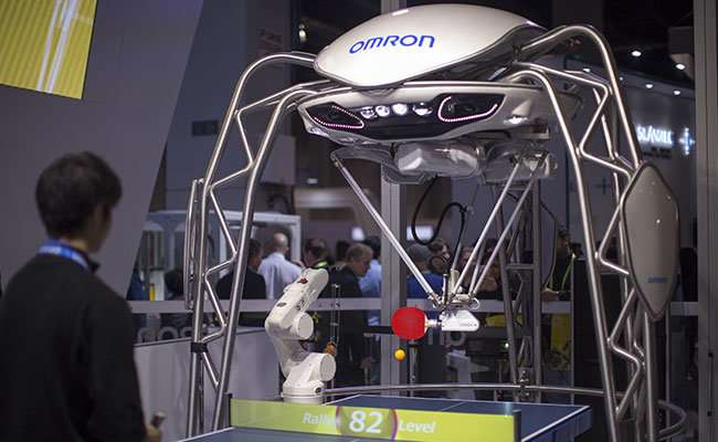There is a robot ready for play at the “Omron” robotics company’s booth. “Forpheus” is a large, ping pong-playing robot designed to demonstrate what its manufacturers call the future of “integration between people and machines”.