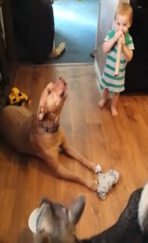 Their secret is that they are not just dogs, they are singer dogs and the Pit Bull will sing the day they want to reveal who it is.