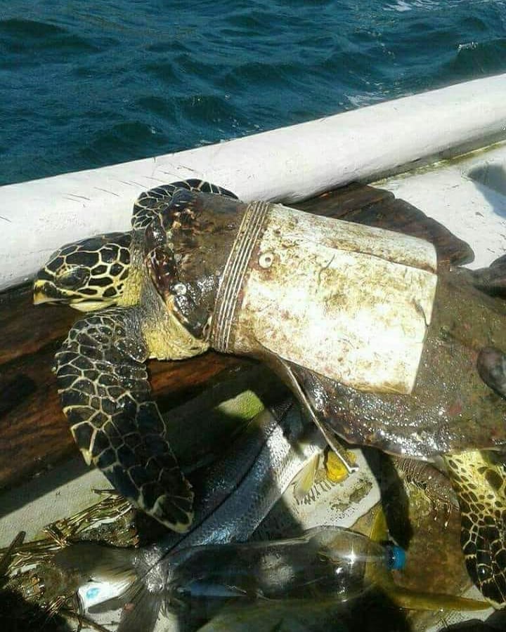 4 This poor turtle got stuck in the remains of a plastic bucket.