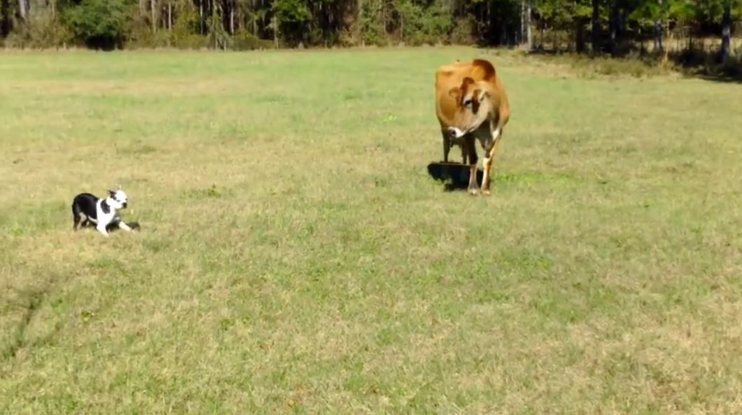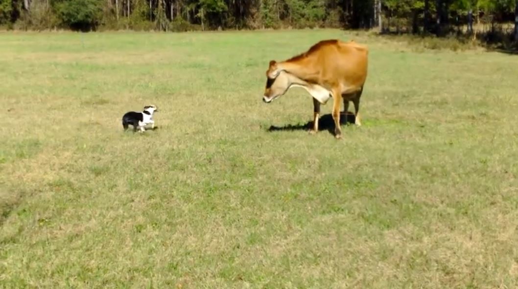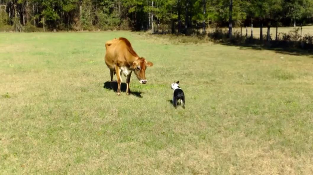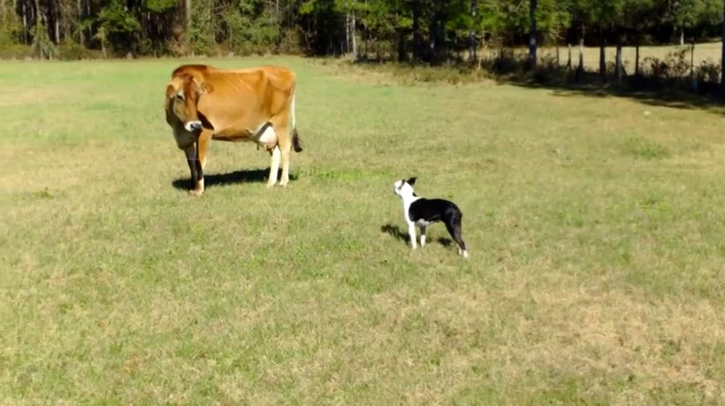 In a video here, there is a dog named Miss Piggie who is a Boston Terrier. It is a happy dog running around in the field chasing the winds and enjoying the fresh sunshine. This is when the dog meets Suzanne, a dairy cow who was in the field too.