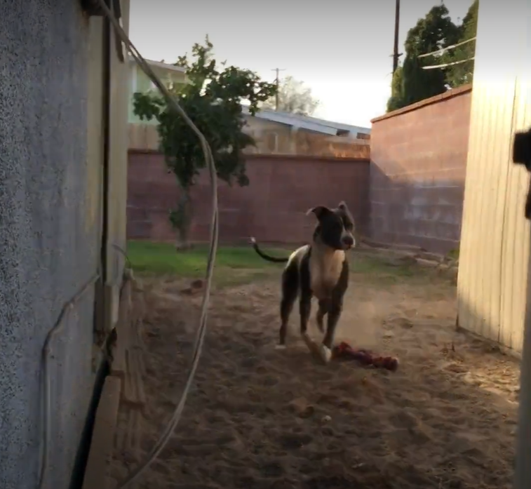 Bronx the Bluenose Pitbull likes to trace his owner Trenton Terrell as the latter hides from him in his backyard in Temecula, California.
