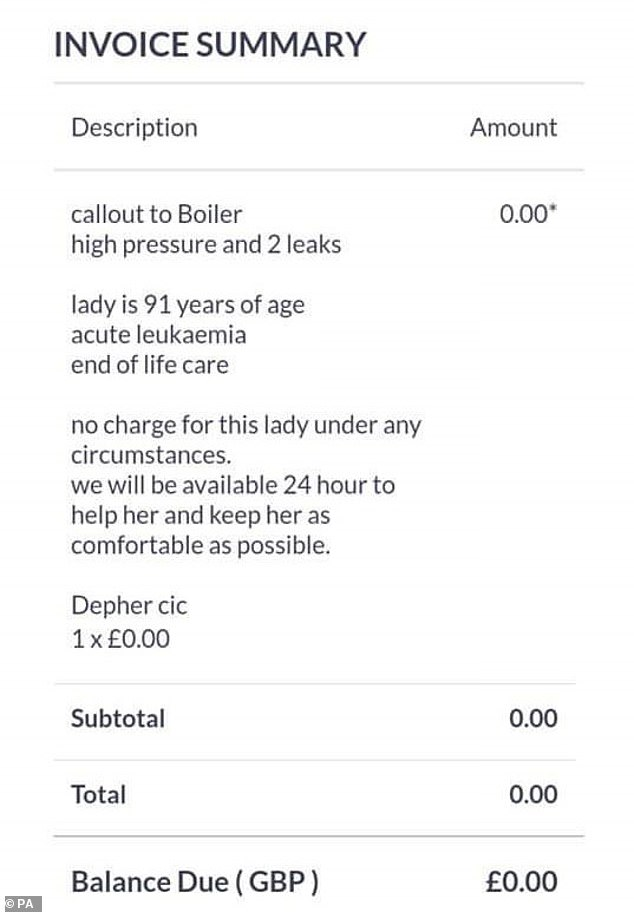 Along with the receipt for boiler repair, there was a note, saying: “No charge for this lady under any circumstances. We will be available 24 hours to help her and keep her as comfortable as possible.”