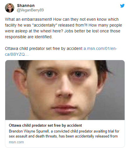 Police are searching for 22-year-old Brandon Spurrell after he was accidentally released because of an administrative error, according to the National Post.