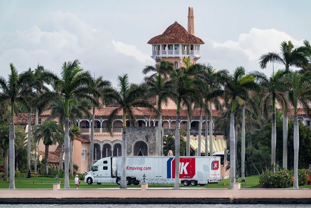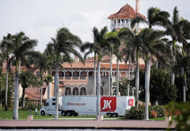 Two Sterling trucks parked in front of Trump’s club and large boxes were carried into the club.
