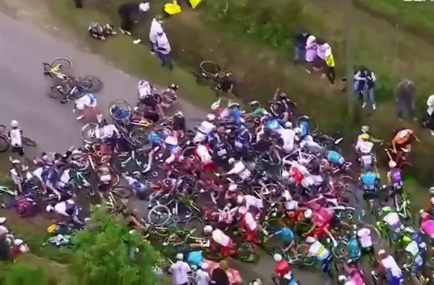 The crash sent Martin and his bicycle tumbling to the ground, eventually leaving at least 20 riders with injuries.