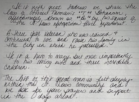 “It is with great sadness we share the loss of officer Tamarris ‘T’ Bohannon, affectionately known as ‘Bo’ by his squad of the St. Louis Metropolitan Police Department,” the tear-jerking tribute read.