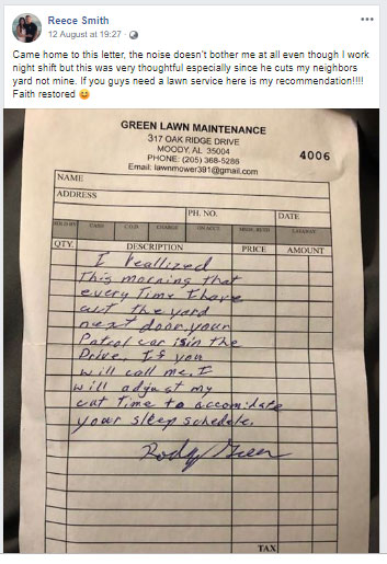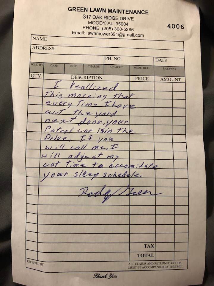 “I realized this morning that every time I have cut the yard next door, your patrol car is in the drive,” he wrote on a blank invoice. “If you will call me, I will adjust my cut time to accommodate your sleep schedule.”