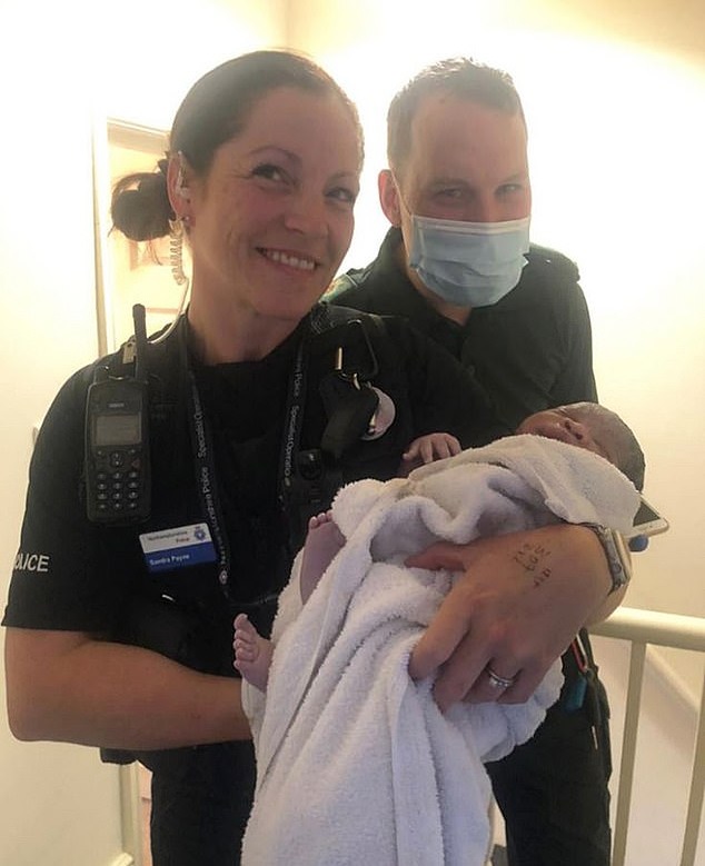 Just minutes after their arrival, PCs Sandra Payne and James Condon successfully helped the couple deliver baby Harris.