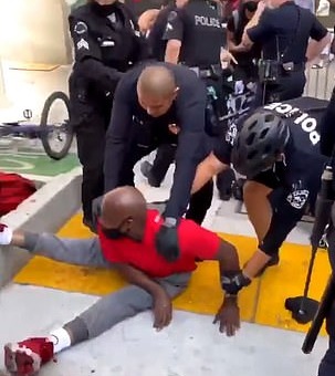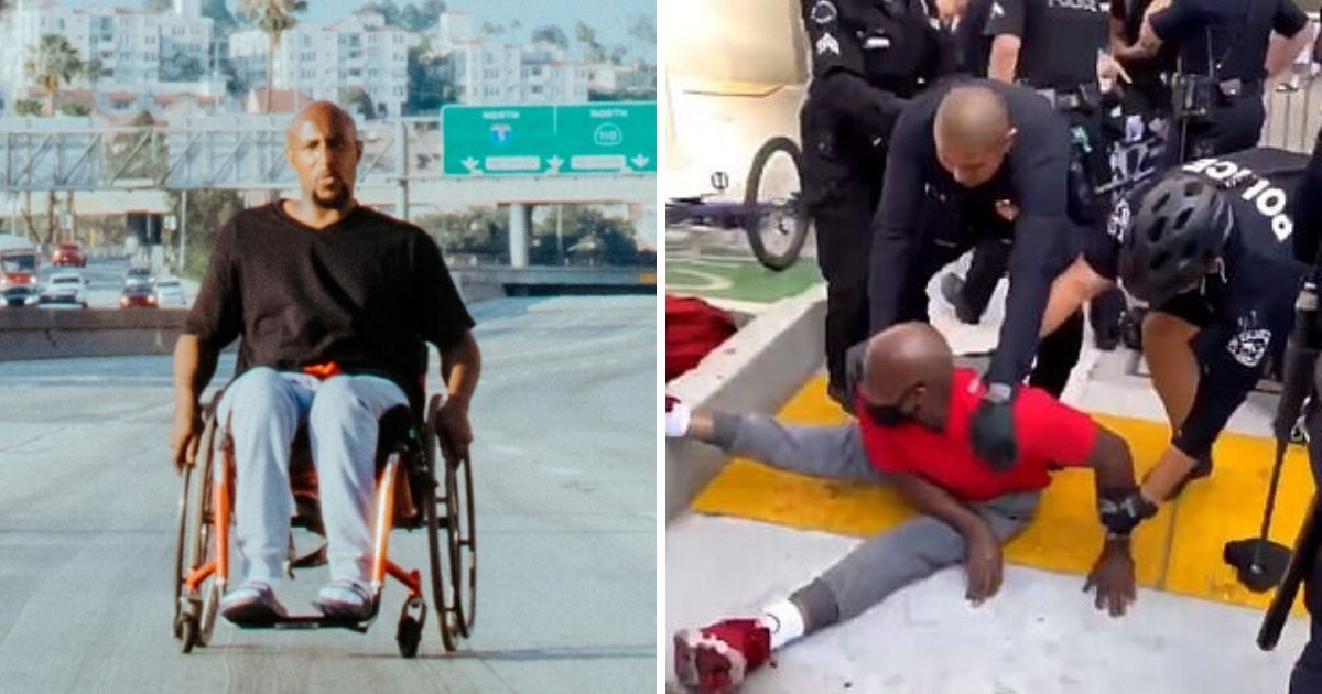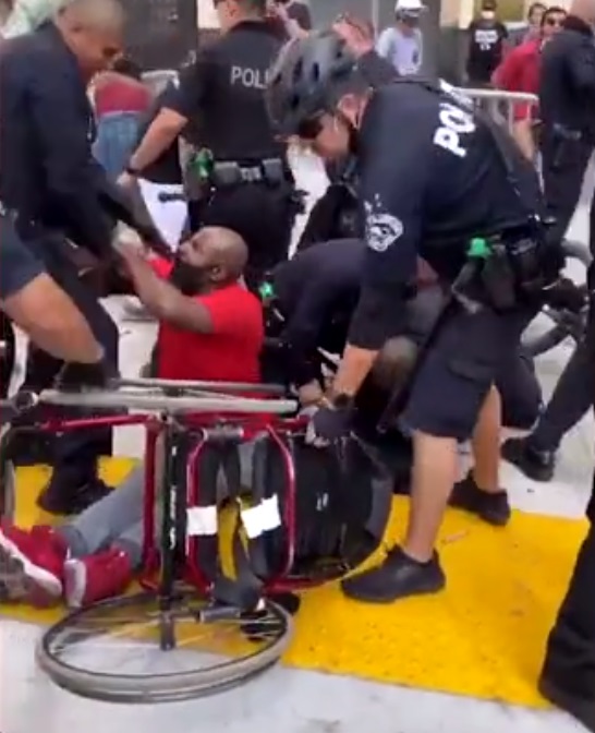One member of the group was also wheelchair-bound Joshua Wilson whom the police grabbed and hurled out of his wheelchair after he punched one of the officers in the face according to the LAPD.