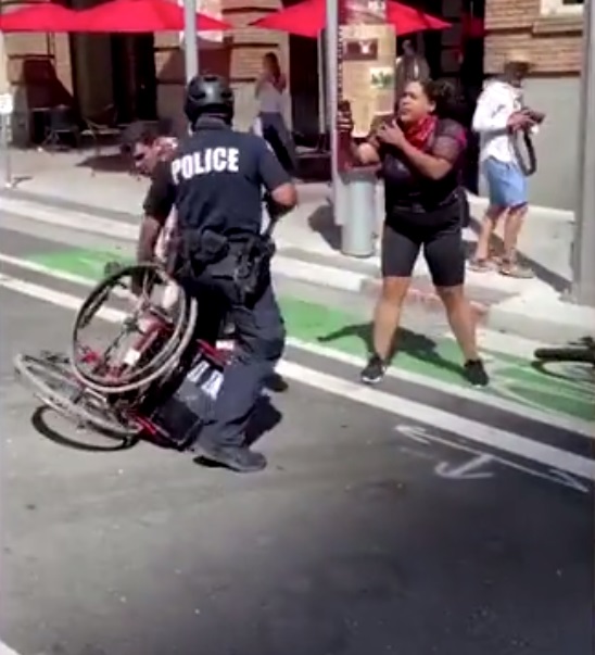 Police officers were caught on camera throwing a protester out of his wheelchair before hurling the device away and arresting the man.