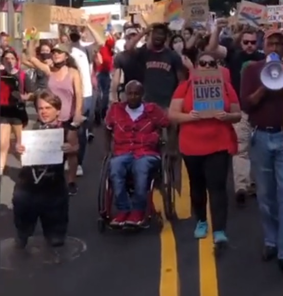 As Mr. Wilson hit the ground, officers restrained him by twisting his arms behind his back. One of the cops was also caught on camera throwing the protester’s wheelchair out of the way.