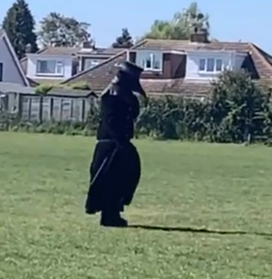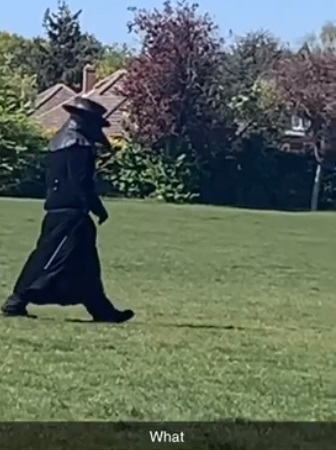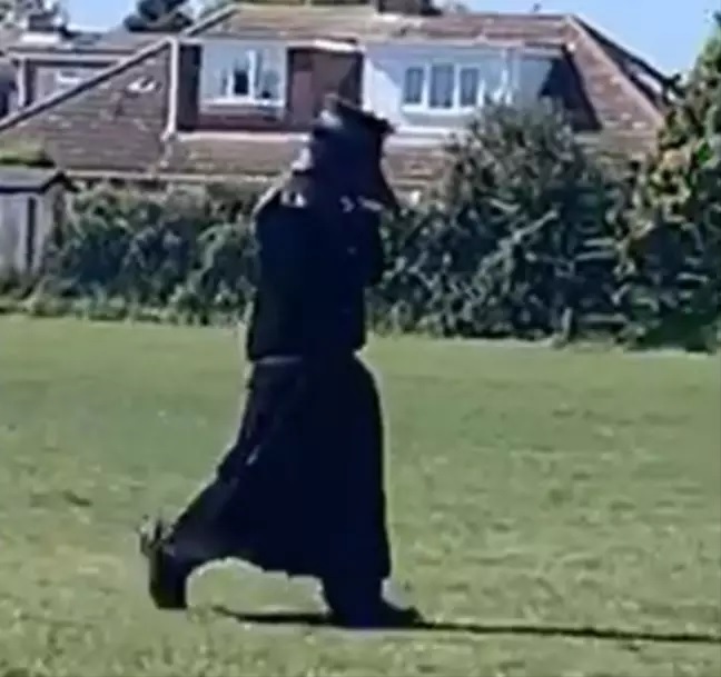 The mysterious figure dressed in a black coat and a creepy-looking beaked mask was spotted in the village of Hellesdon in England where a mother caught them on camera walking around.