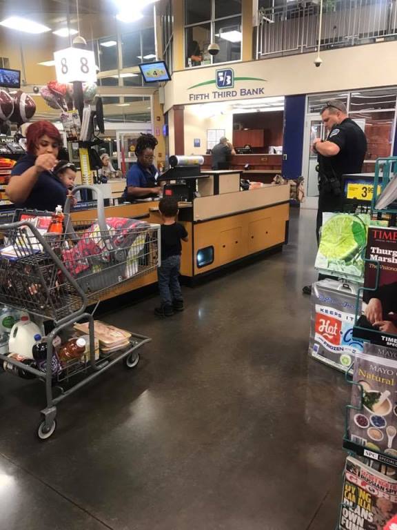 As the mother tried to calm down a crying infant and a young boy, a police officer offered to help her get them all safely into the store.