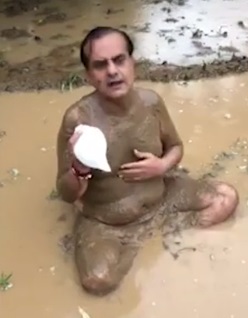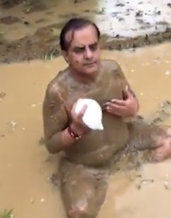 Sukhbir Singh Jaunapuria is a member of the Parliament of India who was recorded blowing a conch shell while sitting shirtless in the mud.