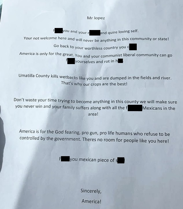 As 29-year-old Jonathan Lopez from Umatilla County, Oregon, previously suggested as he filed a police report, he was subjected to a homophobic and racist letter delivered to him by an anonymous source.
