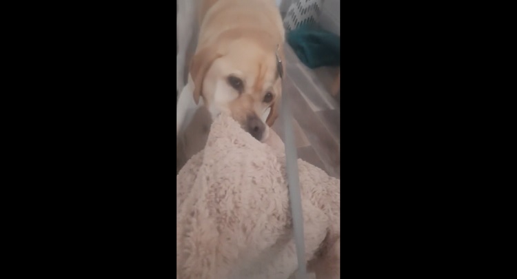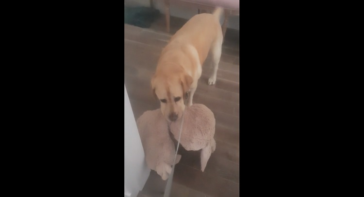 Just like a child who won’t go anywhere without dragging his teddy bear along with him, this dog just refuses to let go despite repeated pleas from his owner.