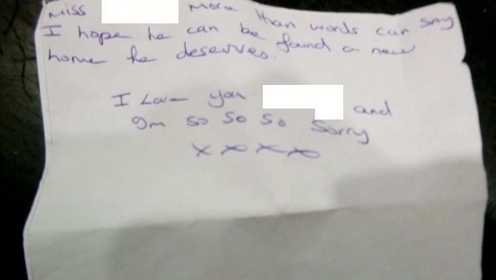 The letter wrote “Believe me as I write this, I am not doing this with any pleasure, my heart is broken into a million pieces because I love my dog but I have no place for him to live anymore or have anything to feed him anymore.