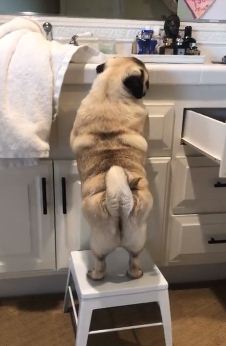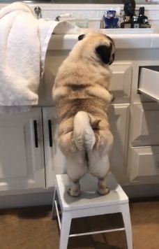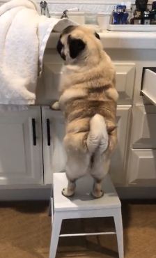 In a video shared on social media, the owner of the pug that can be seen climbed up on a stool at the kitchen counter was trying to get his paws on something he could eat.