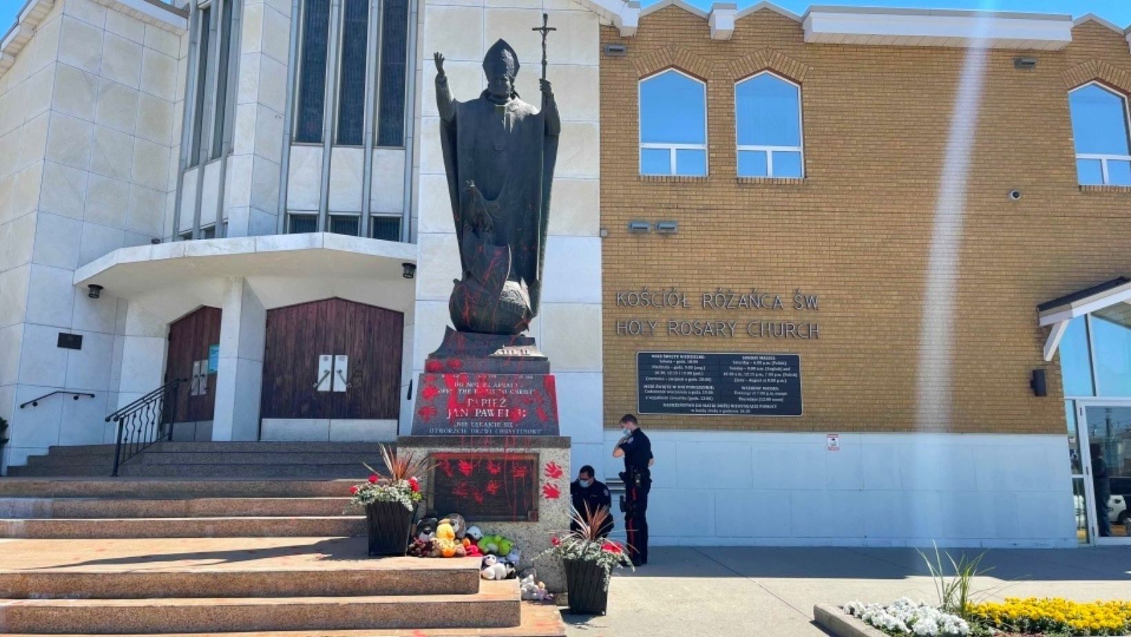 Police in Edmonton said that a female suspect was seen vandalizing the statue of Pope John Paul ll with paint outside the Holy Rosary Catholic Church in Edmonton north of the city’s downtown at around 11 PM on Saturday night.
