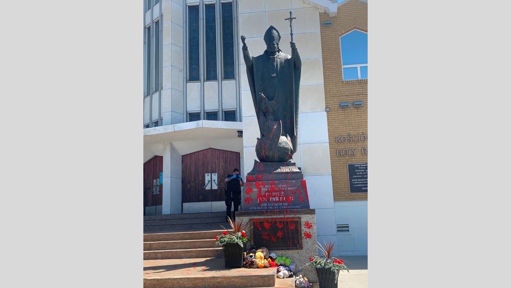 A statue of Pope John Paul II was found covered in red handprints following the discovery of the remains of hundreds of indigenous people.