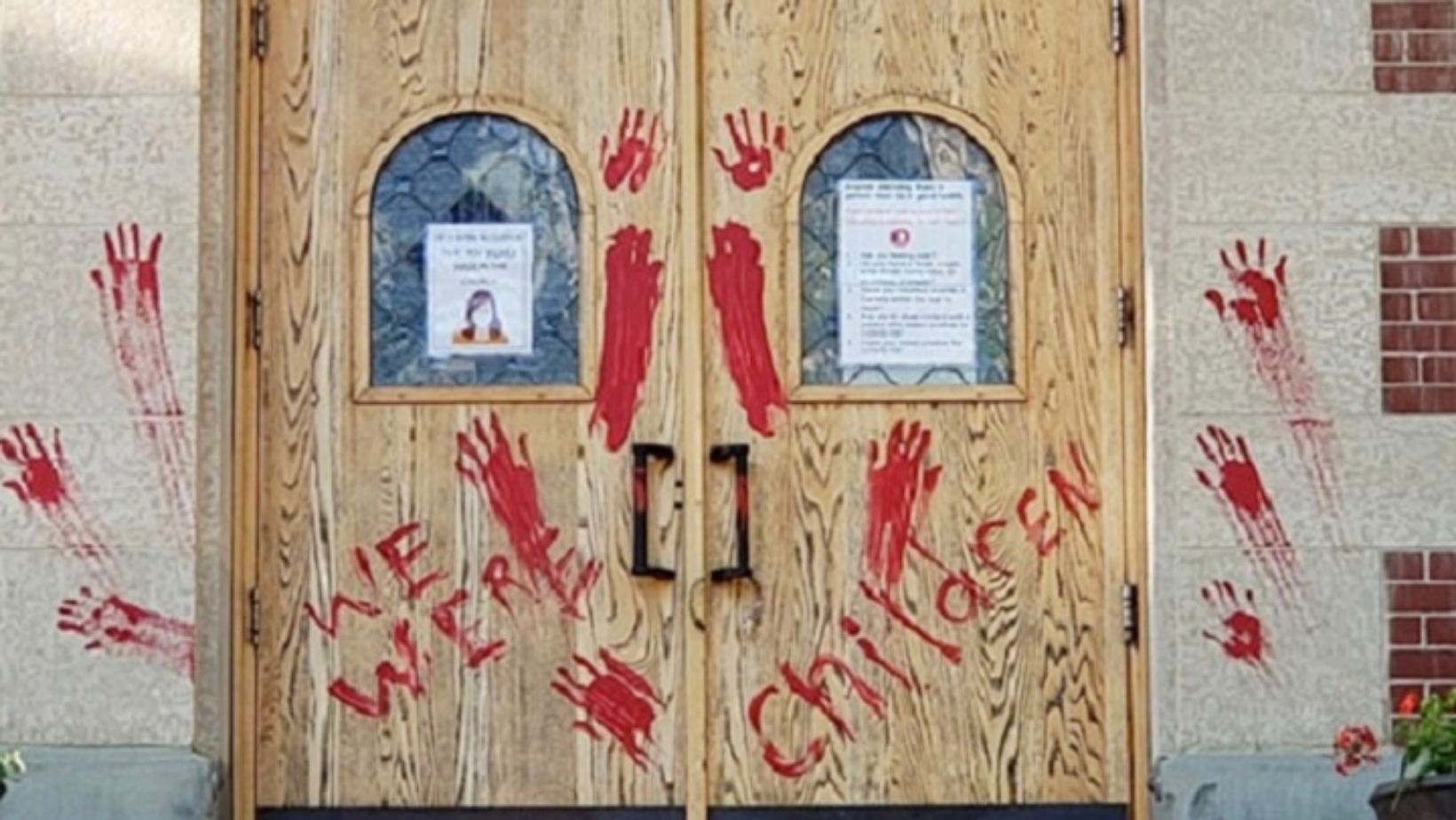 On June 24, the front of a Saskatoon cathedral, St. Paul’s Co-Cathedral, was tagged with red handprints and the words “we were children” were painted on the doors.