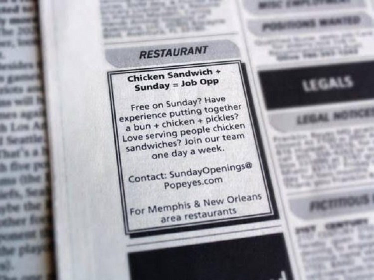 Speaking to Business Insider, Popeyes said: “Popeyes continues to be humbled by the love its guests have shown for The Chicken Sandwich. We decided to have fun with this by posting classified ads, alerting potential hires to some of our openings. And yes, they must have Sundays open.”