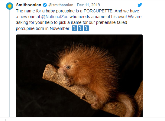 “The name for a baby porcupine is a porcupette. And we have a new one at @NationalZoo who needs a name of his own! We are asking for your help to pick a name for our prehensile-tailed porcupine born in November,” the Smithsonian wrote on Twitter.