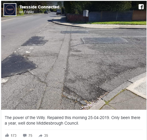 Another person said that when ‘there’s a Willy there is always a way.’ A person from the Middlesbrough Council noted that like all other authority areas in the country even Middlesbrough has issues with potholes which are getting repaired on a priority basis considering the risk for the highway users.