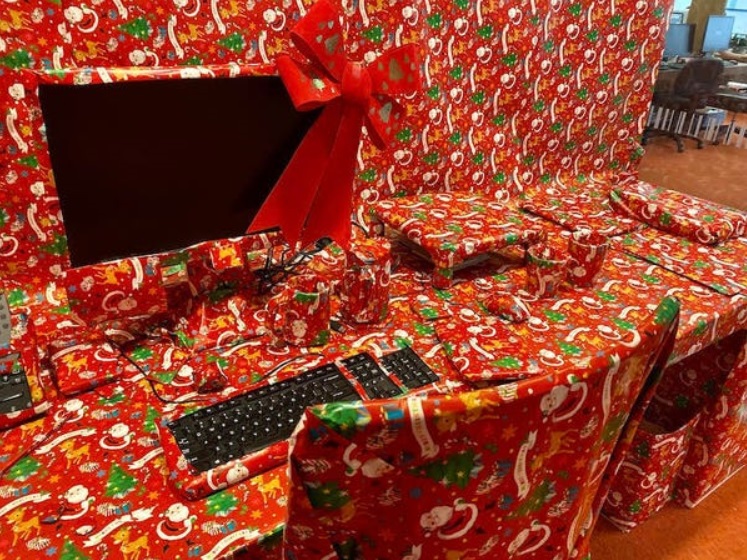 A woman has gone viral after admitting she had covered her boss’ entire office, including small objects such as pens, in wrapping paper after they called in sick.