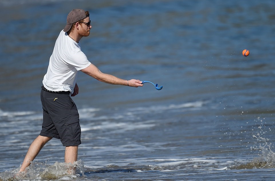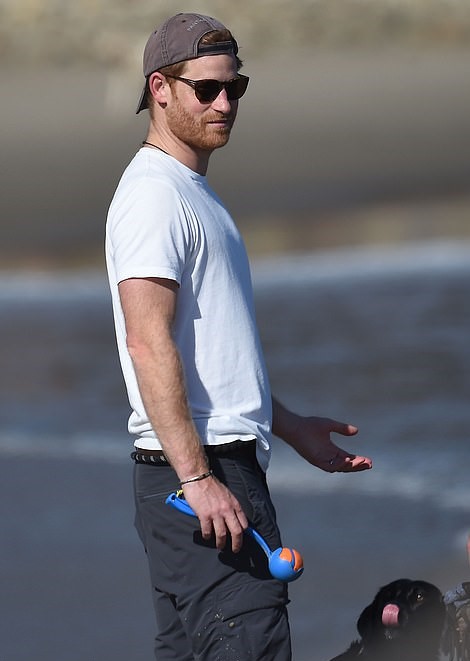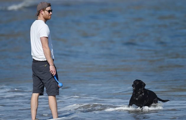 Prince Harry hit the beach in Santa Barbara with his rescue dog Pula – dressed casually in a white T-shirt and dark-colored shorts, a backward baseball cap, and sunglasses as he dipped his feet in the sea.