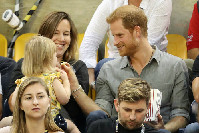 Harry, 33, watching a men’s sitting volleyball match at the Invictus Games and playing with a girl Emily Henson, the daughter of Dave Henson, a Paralympic athlete who lost both of his legs in an IED explosion in Afghanistan in 2011.